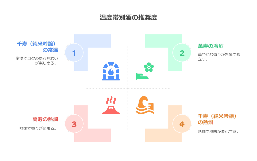 せっかく「萬寿」や「千寿」を選ぶなら、その魅力を最大限に引き出して楽しみたいですよね。ここでは、それぞれのお酒が持つ個性を活かす、おすすめの飲み方(温度帯)と、相性の良い料理(ペアリング)をご紹介します。