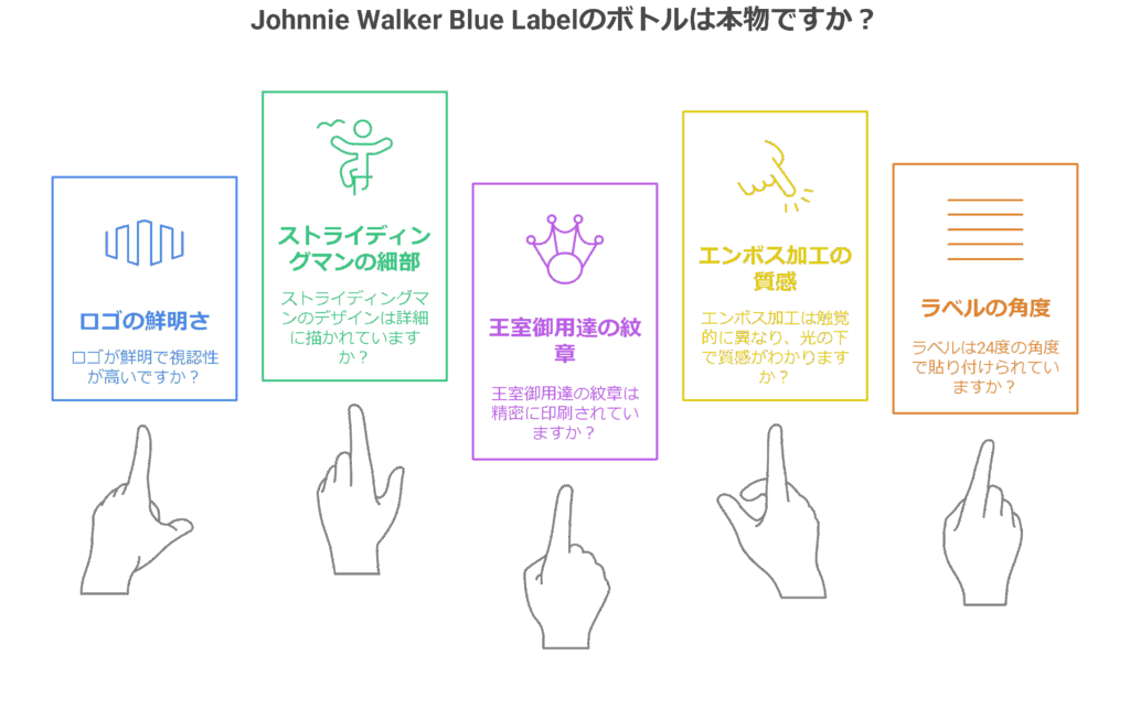 ここからは、いよいよ本題であるジョニーウォーカー ブルーラベルの偽物を見分けるための具体的なチェックポイントを5つご紹介します。偽物も巧妙化していますが、細部に注意を払うことで見抜ける可能性が高まります。複数のポイントを総合的に確認することが肝心です。