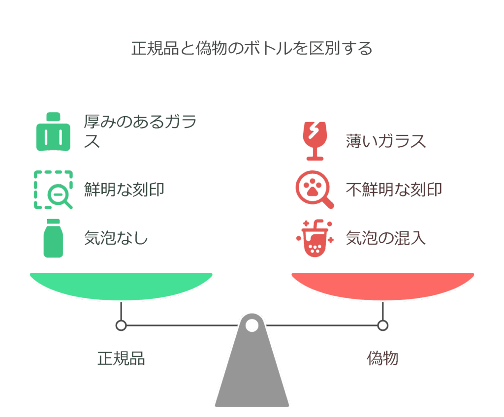 - 正規品は、ガラスに厚みがあり、特徴的な青みがかった色合いで、均一な仕上がりです 。相応の重量感があることも特徴です 。特にボトルの底面には、製造に関する刻印(製造者コードや日付コードなど)が鮮明に入っていることが多いです。